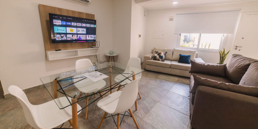 Contamos con cuatro departamentos distribuidos entre planta baja y primer piso, completamente equipados para una perfecta estadía, solo o en familia. Estilo, decoración y tecnología a su servicio.
